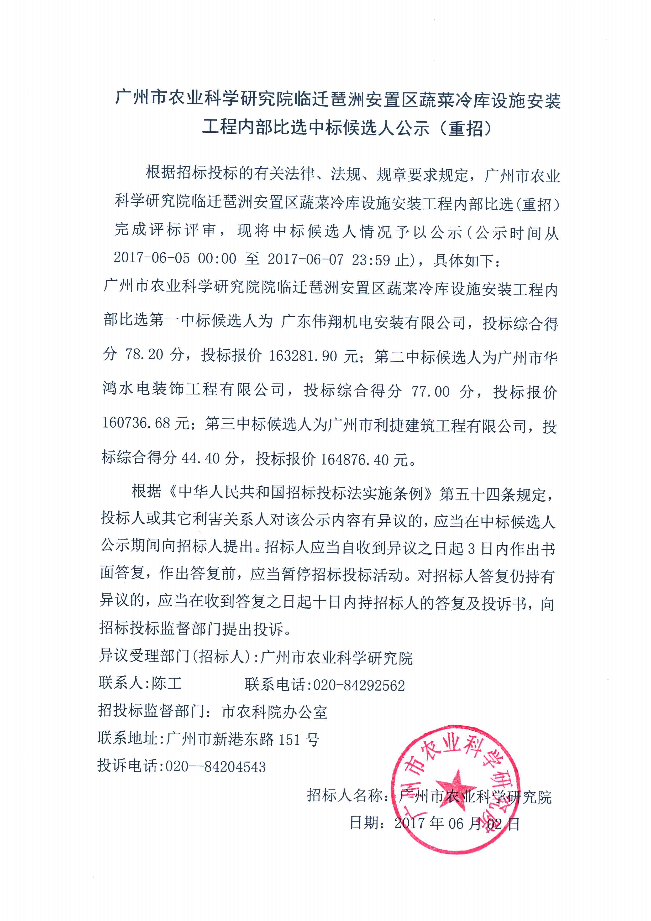 - 广州市农业科学研究院临迁琶洲安置区蔬菜冷库设施安装工程内部比选中标候选人公示(重招) 2017-06-02