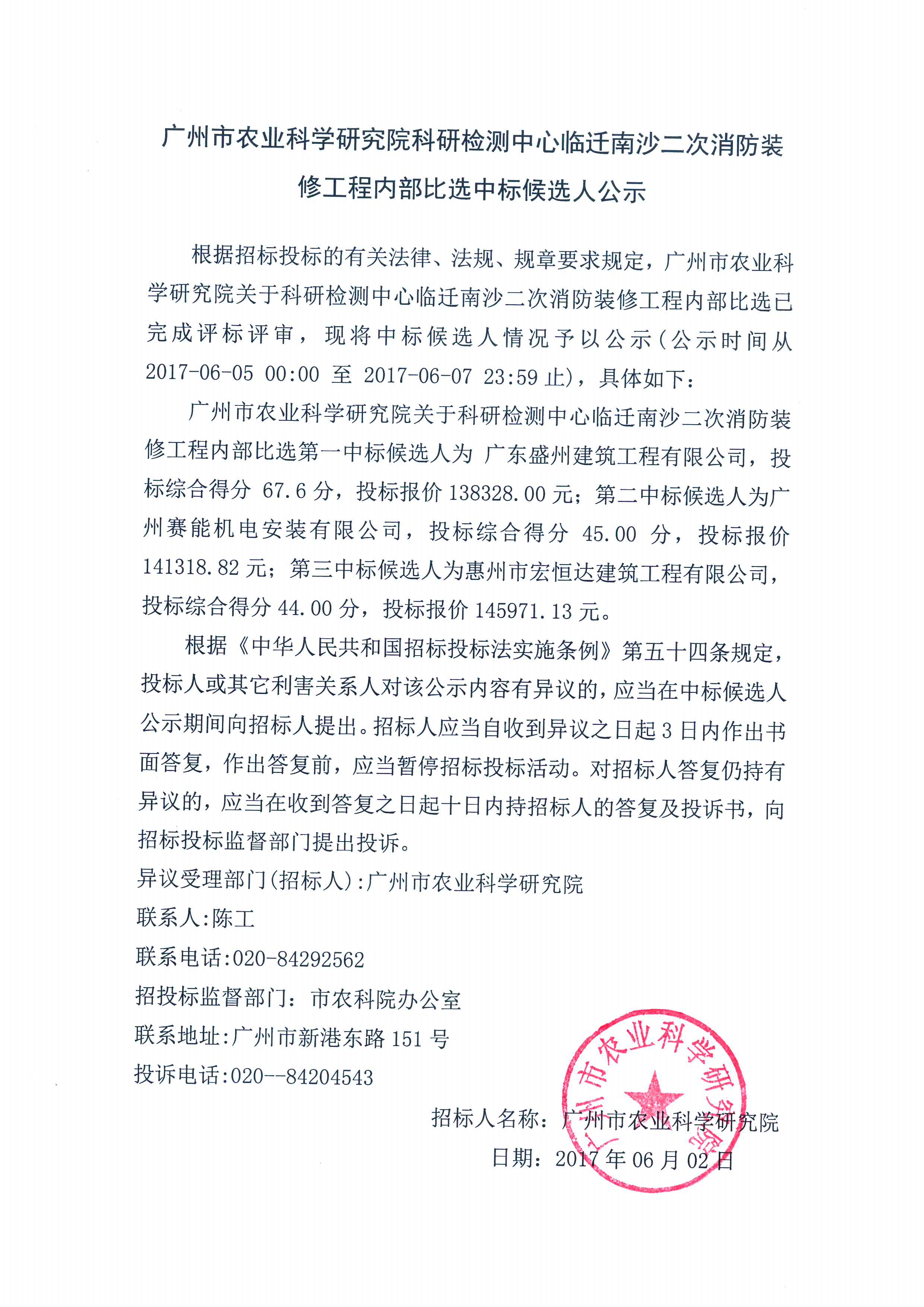 - 广州市农业科学研究院科研检测中心临迁南沙二次消防装修工程内部比选中标候选人公示 2017-06-02
